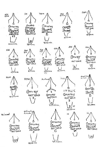 To the best of my knowledge all these nibs are different. The numbers in the left column refer to the nibs numbered in order from the top left to the bottom right. I have noted the pen numbers belonging to each nib in the second column, and the nib size in the third column from the left. This is not a comprehensive list since I prepared it before I had acquired many of the pens in my collection.