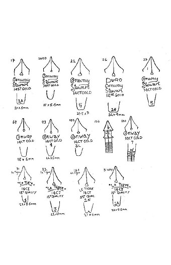 To the best of my knowledge all these nibs are different. The numbers in the left column refer to the nibs numbered in order from the top left to the bottom right. I have noted the pen numbers belonging to each nib in the second column, and the nib size in the third column from the left. This is not a comprehensive list since I prepared it before I had acquired many of the pens in my collection.